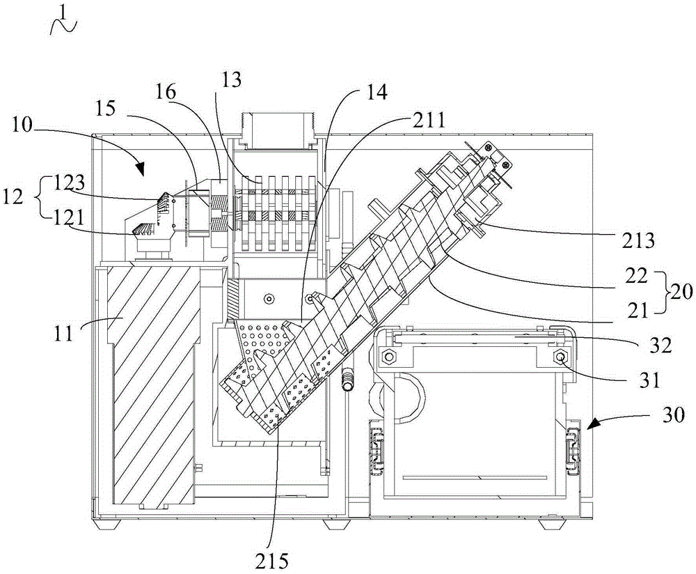 垃圾预处理装置,所述垃圾预处理装置用于将垃圾进行预处理;垃圾脱水装置,所述垃圾脱水装置与所述垃圾预处理装置连接,经所述垃圾预处理装置预处理后的垃圾进入所述垃圾脱水装置,所述垃圾脱水装置用以将所述预处理后的垃圾进行脱水;以及排放处理装置,其包括干垃圾处理模块以及水处理模块,所述干垃圾处理模块以及水处理模块分别与所述垃圾脱水装置连接。)